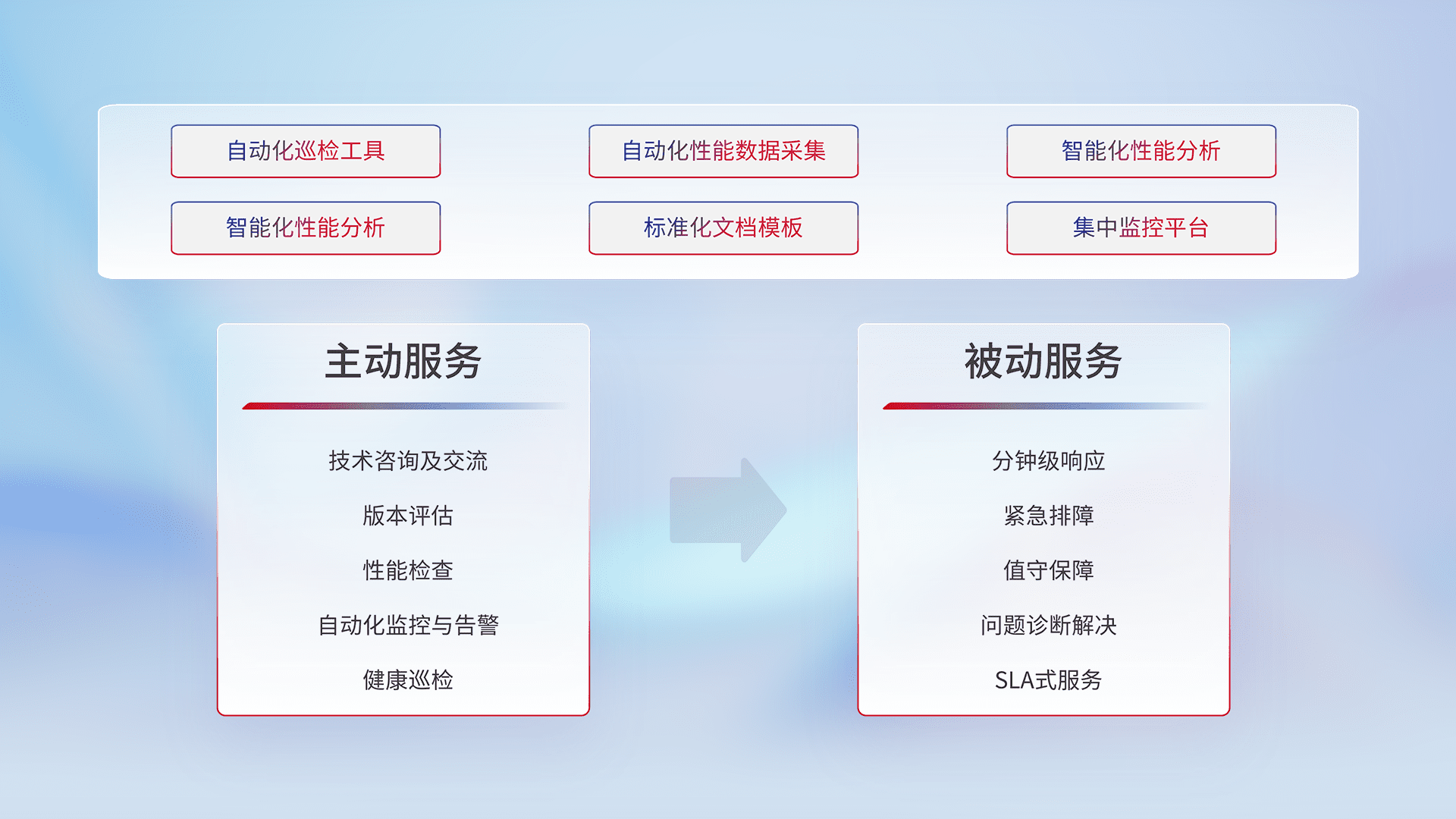 智能化工具和标准化文档,,,保障服务质量,,,,提供主动服务(包含技术咨询、、、版本评估、、、性能检查、、、自动化监控与告警、、、、健康巡检)和被动服务包含(分钟级响应、、紧急排障、、、值守保障、、问题诊断解决、、SLA服务)。。。
